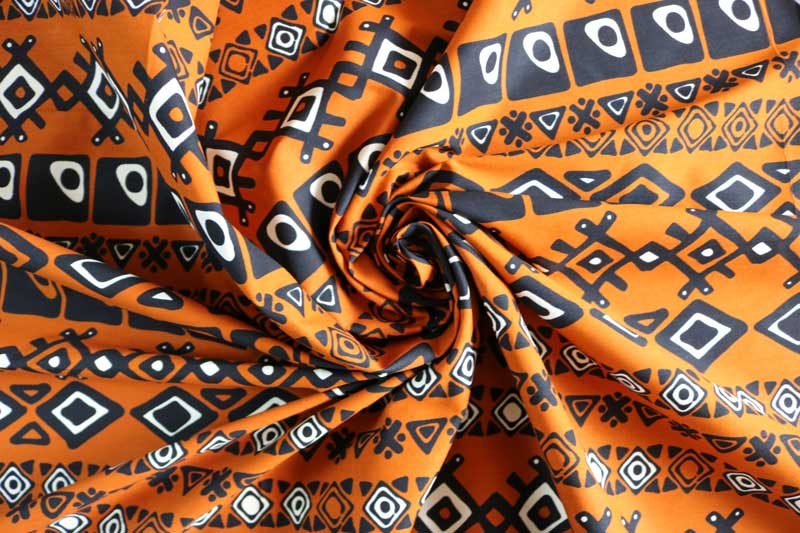 O tecido africano Wax laranja e preto é ideal para projetos criativos com personalidade.
